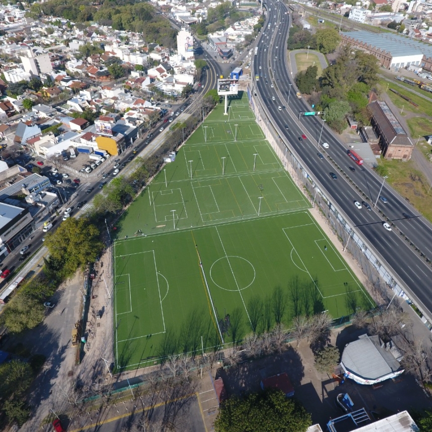 Los 16.100 mts2 de césped sintético con caucho tapizan la superficie y demarcan:
